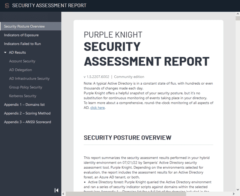 Toujours un peu plus bas dans le rapport, il y a un score par catégorie cette fois-ci. Sur son site, Semperis précise : "Le score global moyen de Purple Knight est de 61 %, la sécurité de Kerberos étant en moyenne de 43 % et celle de Group Policy de 58 %.", ce qui vous permettra de vous situer. En naviguant dans le menu à gauche du rapport, on peut parcourir chaque section et voir l'ensemble des points vérifiés avec le résultat associé.