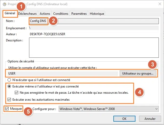 Dans l’onglet « Général », on nomme la tâche, on choisit son exécutant (ici l’administrateur du poste). On coche les options « Exécuter même si l’utilisateur n’est pas connecté », « Ne pas enregistrer le mot de passe. La tâche n’accède qu’aux ressources locales » et « Exécuter avec les autorisations maximales ». Enfin, on coche la case « Masquer ».