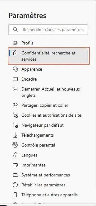 Ensuite, on clique sur l’option « Confidentialité, recherche et services » (en saisissant « edge://settings/privacy » dans la barre d’adresse du navigateur, on parvient au même résultat plus rapidement).