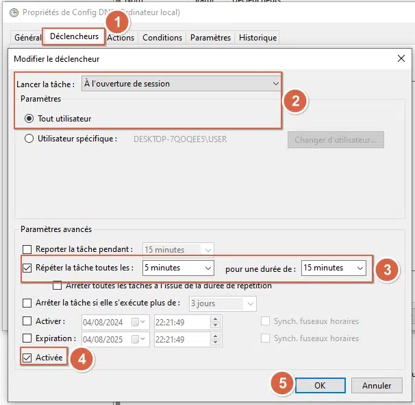 Puis, on va sur l’onglet « Déclencheurs » et on choisit le moment d’exécution de la tâche, ici « A l’ouverture de session » et on choisit « Tout utilisateur » en paramètres. On choisit ensuite la fréquence de répétition de la tâche (ici toutes les 5 minutes pendant 15 minutes) et enfin, on l’active.