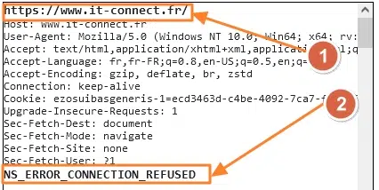 Cette méthode marche effectivement et renverra les requêtes vers www.it-connect.fr à l’adresse 127.0.0.1, ainsi le PC va « croire » que l’hôte correspondant à ce domaine est celui spécifié dans le fichier hosts. Ce n’est pas le cas, donc le paquet se détruira au bout d’une certaine période et renverra un message de type « NS_ERROR_CONNECTION_REFUSED » (NS pour Name Server ou Serveur de Nom).