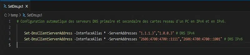 Pour ce faire, on reprend simplement les commandes PowerShell utilisées plus haut et on les place dans un fichier qu’on enregistre ensuite avec l’extension « .ps1 », bien évidemment vous pouvez le nommer comme bon vous semble. Pour ce tutoriel, on l’appellera « SetDns.ps1 ».