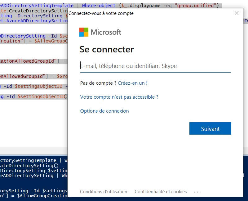 Lors de l'exécution, il sera nécessaire de vous authentifier sur votre tenant avec un compte Administrateur du tenant Microsoft 365 : une fenêtre va apparaître à l'écran, comme ceci :