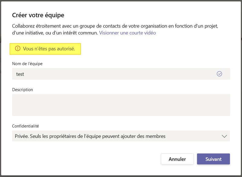 Une fois l'opération réalisée, lorsque l'on essaie de créer une équipe Teams à partir d'un compte utilisateur qui n'est pas membre du groupe de sécurité, le message "Vous n'êtes pas autorisé" s'affiche dans Teams. Le blocage est opérationnel !