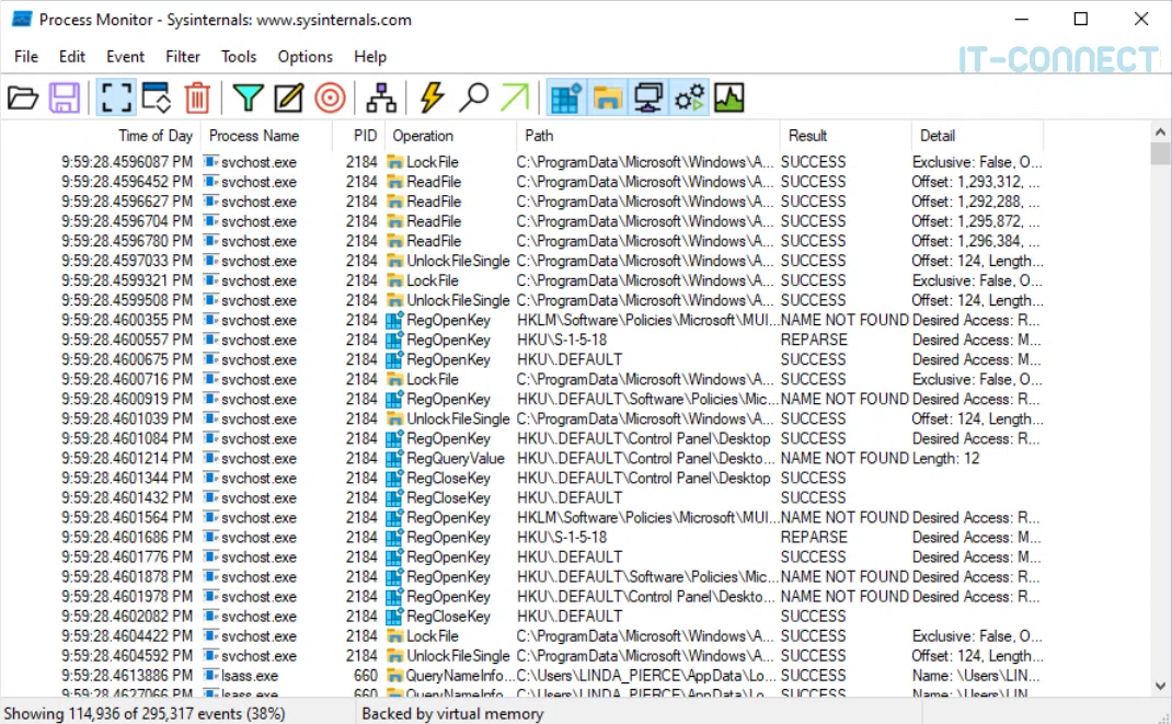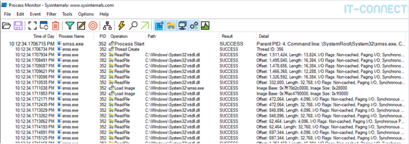 C’est dans ce fichier que sont stockés les évènements capturés depuis le démarrage. Tant qu’il n’est pas ouvert par l’intermédiaire de ProcMon, ce dernier continuera de capturer des évènements.