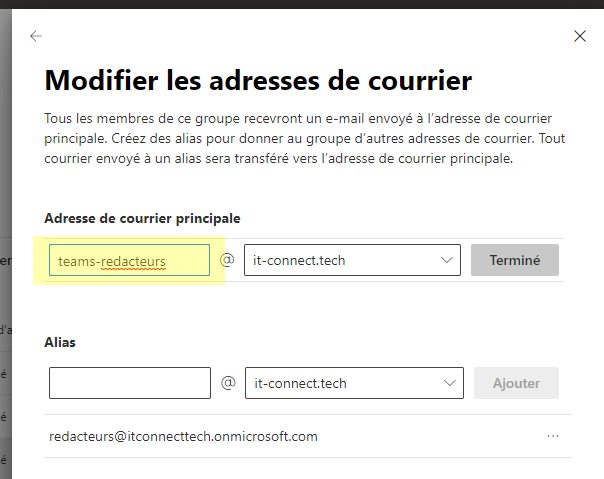 La page "Modifier les adresses de courrier" va s'ouvrir. On va modifier le champ "Adresse de courrier principale" pour indiquer "teams-redacteurs" à la place de "redacteurs". Il suffit de cliquer sur "Terminé".
