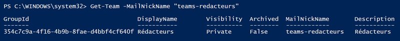 # Vérifier la présence de l'équipe Teams Get-Team -MailNickName "teams-redacteurs"