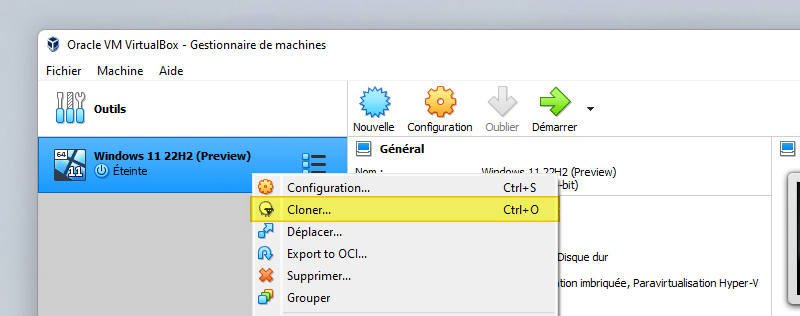 À titre d'exemple, je vais prendre une VM Windows 11 de VirtualBox que je vais cloner afin d'en avoir une deuxième. Avant de cloner votre VM, je vous invite à lire la dernière partie de ce tutoriel, car il faut tenir compte de certains détails avant d'initier le clonage d'une machine virtuelle.