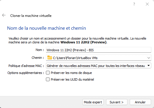 - Préserver les UUID du matériel : ne cochez pas cette option afin de générer de nouveau UUID (Universally unique identifier). À mon sens, c'est préférable sauf si cela est susceptible de perturber le fonctionnement d'une application qui serait présente dans votre VM.