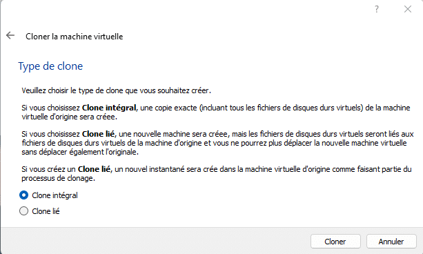 - Clone intégral : il s'agit d'un clone complet de la machine virtuelle source (disque, configuration, etc.), qui devient totalement indépendant