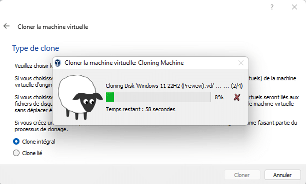 Cliquez sur "Cloner" afin de démarrer le clonage de la machine virtuelle. En fonction des performances de votre machine physique et de la taille de la VM, l'opération sera plus ou moins rapide.