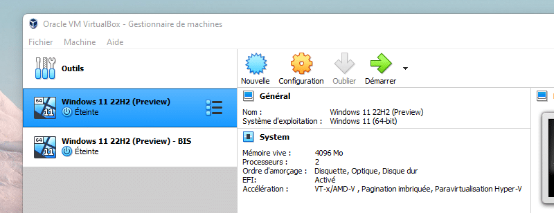 Dès que l'opération sera terminée, les deux machines virtuelles seront disponibles dans VirtualBox ! Désormais, j'ai deux machines virtuelles sous Windows 11, totalement identiques et indépendantes, à ma disposition.