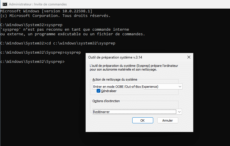 L'application "Outil de préparation système" va s'ouvrir. Choisissez l'action "Entrer en mode OOBE", cochez la case "Généraliser" et prenez l'option "Arrêter le système" (ou "Redémarrer"). Cliquez sur "OK".
