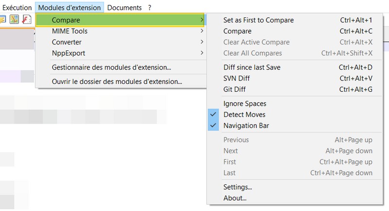 Retournons maintenant sur Notepad++. Cliquez à nouveau sur "Modules d'extension", et cette fois-ci vous avez "Compare" qui s'est ajouté dans le menu. Je vous propose d'ouvrir dans l'éditeur les deux fichiers que vous souhaitez comparer puis de cliquer sur "Compare". A noter l'existence d'un raccourci clavier : CTRL+ALT+C.