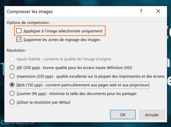 Une fenêtre intitulée "Compresser les images" va s'ouvrir. Si vous souhaitez compresser l'ensemble des images de votre présentation, décochez l'option "Appliquer à l'image sélectionnée uniquement". A contrario, pour compresser seulement cette image, laissez cette case cochée.