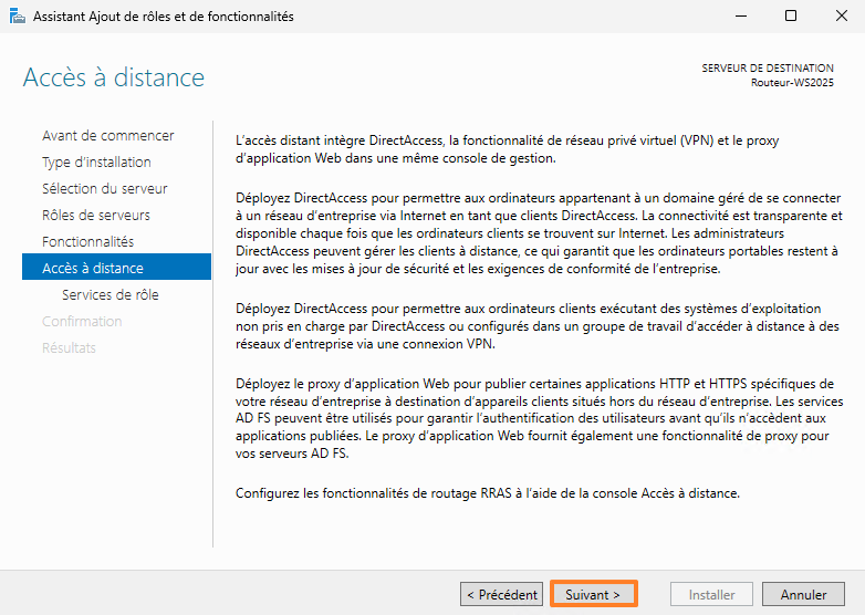 À l'étape "Rôles de serveurs", veillez à sélectionner le rôle intitulé "Accès à distance".
