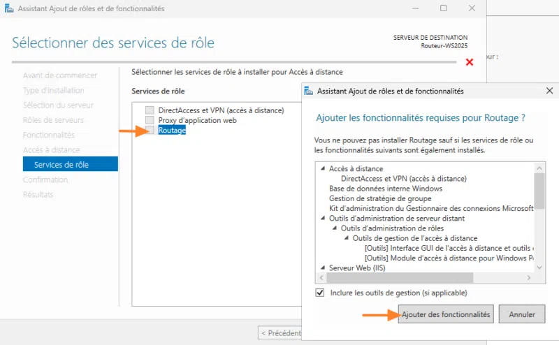 Vous devez installer le service de rôle nommé "Routage" et accepter l'installation des outils d'administration. En réalité, cela va également cocher et donc installer le service "DirectAccess et VPN (accès à distance)", ce que nous acceptons.