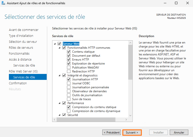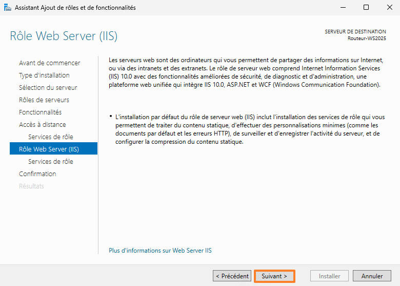 Le serveur Web IIS sera également installé sur le serveur (conséquence directement des choix effectués précédemment). Par la suite, vous pourrez arrêter le serveur Web IIS sur votre routeur, car il ne présente aucun intérêt vis-à-vis de notre objectif du jour.