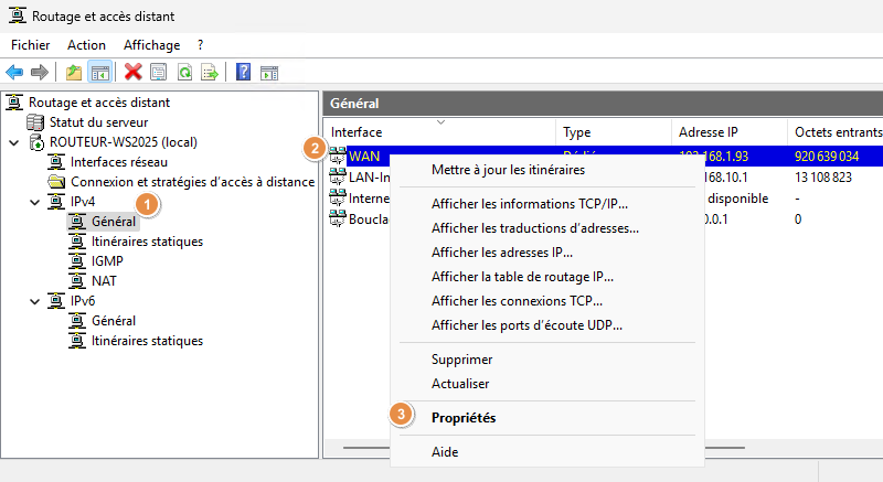 Cliquez sur "IPv4", sur "Général", puis effectuez un clic droit sur "WAN" afin d'accéder aux propriétés de l'interface.