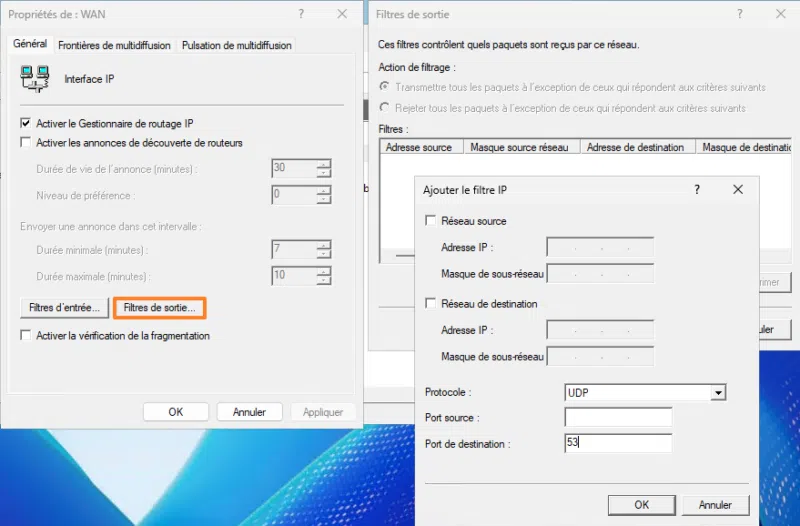 Donc, une nouvelle fenêtre va s'ouvrir. Cliquez sur le bouton "Filtres de sortie" puis ajoutez une nouvelle règle via le bouton "Nouveau". Configurez une première règle. Pour autoriser les flux DNS sortants, il suffit de choisir le protocole "UDP" et de spécifier "53" comme numéro de port de destination.
