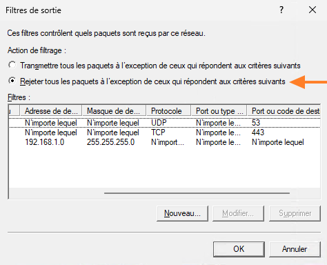Enfin, pour finir, choisissez l'action de filtrage nommée "Rejeter tous les paquets à l'exception de ceux qui répondent aux critères suivants".