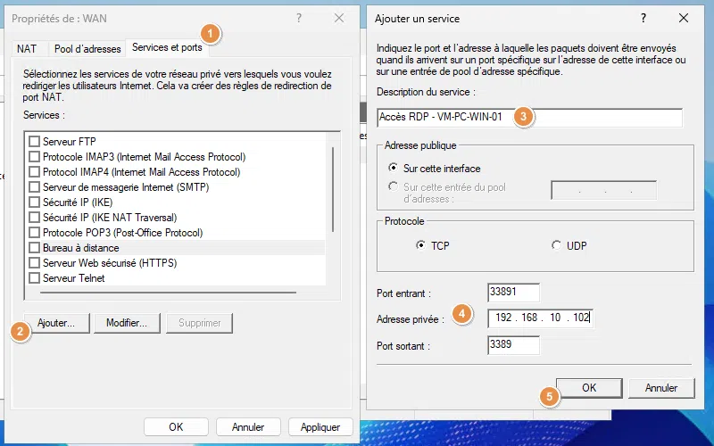 Ici, l'objectif sera de se connecter sur le port "33891" sur l'adresse IP WAN du routeur dans le but d'être redirigé vers le port "3389" de la VM avec l'adresse IP "192.168.10.102".