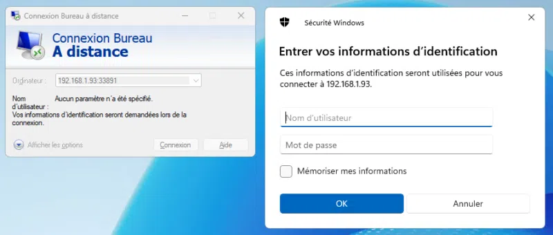 Finalement, grâce à cette règle, depuis une machine distante, il m'est possible de me connecter à la machine virtuelle. Pour cela, il convient de préciser l'adresse IP de l'interface WAN du routeur, ainsi que le numéro de port. Pour ma part, ce sera donc : 192.168.1.93:33891. Le flux sera redirigé vers 192.168.10.102:3389.