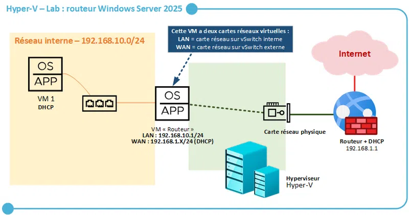 Ci-dessous, un exemple d'implémentation de ce routeur sur un hyperviseur Hyper-V. La plateforme de virtualisation importe peu, la configuration présentée ne concerne pas seulement Hyper-V.
