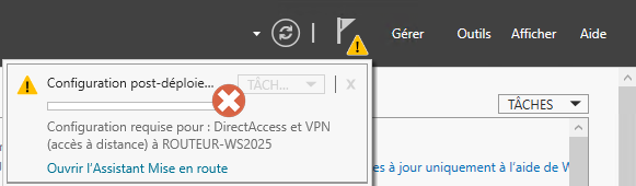 Pour continuer la mise en place de notre routeur, nous devons configurer le routage (et le NAT). Suite à l'installation du rôle, un avertissement apparaît dans le Gestionnaire de serveur, afin de nous inviter à lancer un assistant de configuration. Cela n'est pas utile dans notre cas, vous pouvez l'ignorer.
