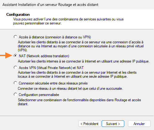 Un nouvel assistant se lance. Passez la première étape. Ensuite, choisissez le modèle de configuration nommé "NAT (Network Address Translation)", sauf si vous ne souhaitez pas faire de NAT. Dans ce cas, vous pourriez opter pour la configuration personnalisée.