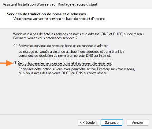 L'étape suivante vous alerte sur le fait que les services DNS et DHCP n'ont pas été détectés sur la machine locale. L'installation de ces deux rôles facultatifs est envisageable, mais elle reste optionnelle. Si vous montez un environnement avec un Active Directory, il y a de fortes chances pour que le serveur DNS soit déjà hébergé par le serveur contrôleur de domaine. De ce fait, il est préférable de sélectionner l'option "Je configurerai les services de noms et d'adresses ultérieurement".