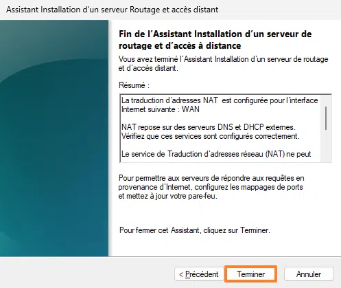 Enfin, cliquez sur "Terminer" pour valider la configuration. Une erreur va certainement apparaître : "Le service d'accès à distance (RAS) ne peut pas activer le routage et l'accès à distance pour la probable raison suivante : impossible d'ouvrir des ports...". Cliquez simplement sur "OK", cela n'aura pas d'impact pour la suite des événements.