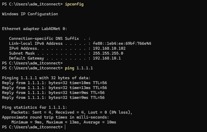 À partir d'une machine connectée directement sur le réseau LAN interne, qui a une adresse IP fixe, un ping vers une adresse IP externe fonctionne bien ! Si vous le souhaitez, vous pouvez installer un serveur DHCP sur Windows Server, sur la même machine que le routeur.