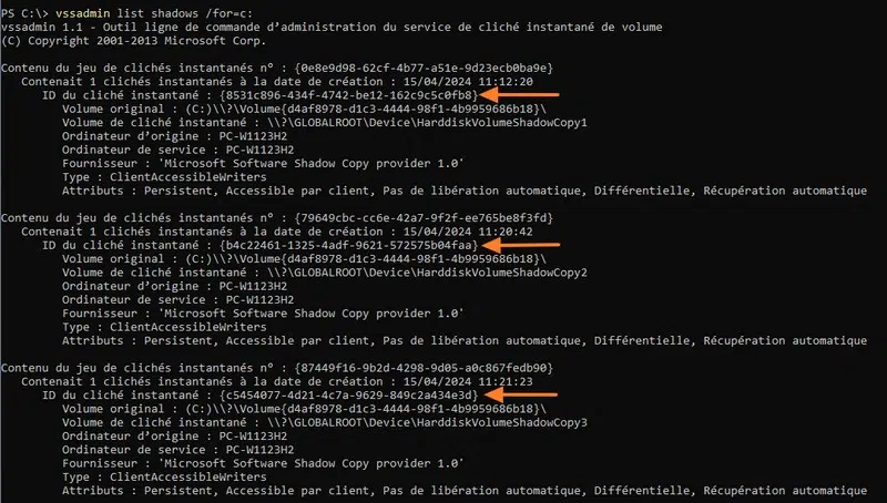 Le problème, c'est que cette commande ne retourne pas les noms des points de restauration, donc il faudra essayer de s'appuyer sur la date et l'heure pour identifier le point de restauration à supprimer. Ensuite, pour supprimer le point de restauration, vous devez spécifier son identifiant, c'est-à-dire son "ID du cliché instantané".