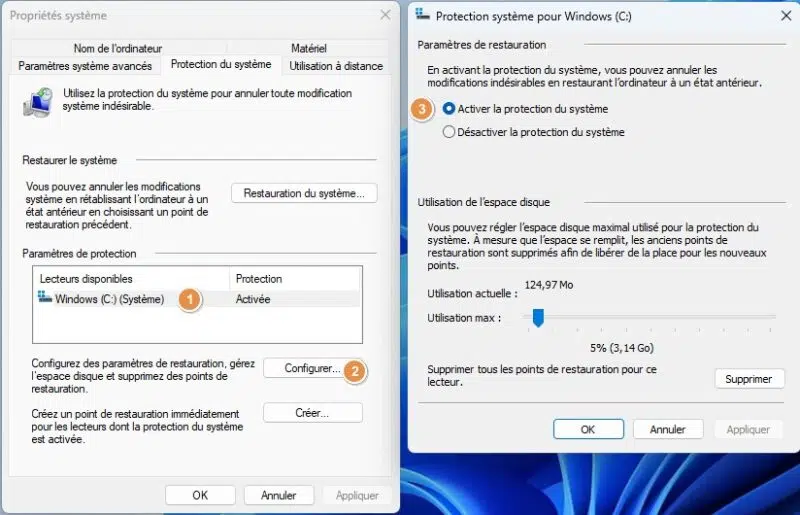 3 - Ici, vous pouvez activer ou désactiver la protection du système, veillez à ce que l'option "Activer la protection du système" soit sélectionnée. Vous pouvez également voir l'espace disque consommé par cette fonctionnalité, et autoriser l'utilisation de plus ou moins d'espace disque.