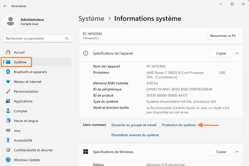 Sur votre PC Windows 11, ouvrez les "Paramètres", cliquez sur "Système" à gauche puis sur "Informations système" afin de cliquer sur "Protection du système" dans la section avec les liens connexes. Vous pouvez aussi appeler le raccourci suivant dans la zone de recherche de Windows :