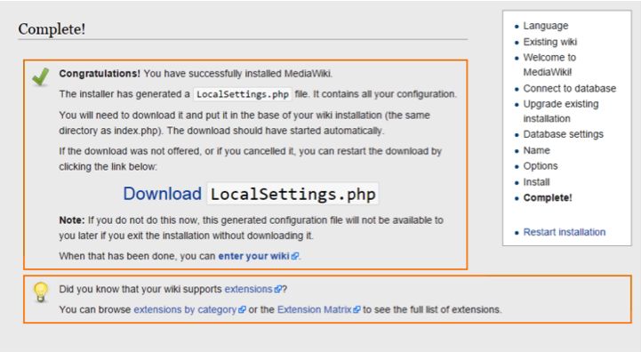 Afin de finaliser l’installation du serveur MediaWiki, comme suggéré sur la capture d’écran, il faut télécharger le fichier LocalSettings.php sur le serveur local, en cliquant sur le lien qui nous est proposé. Le téléchargement devrait s’effectuer automatiquement. Ce fichier et son contenu doivent être placés dans le répertoire /var/www/html :