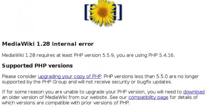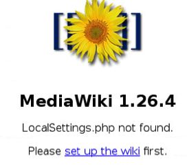 S’il n’est pas possible de mettre à jour la version PHP, alors il faut passer à une version MediaWiki plus ancienne, comme la version 1.26.4. Normalement, après avoir copié le contenu du sous-répertoire mediawiki-1.26.4 dans /var/www/html, l’exécution de l’url http://<Server>, devrait permettre de visualiser l’écran suivant :