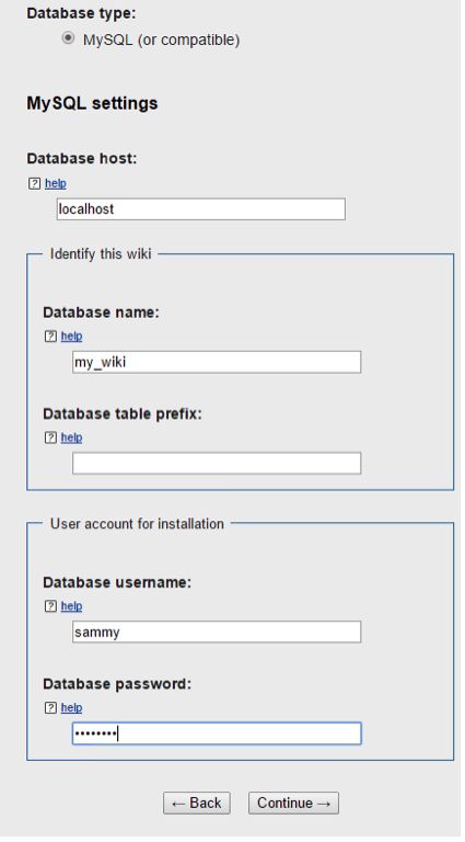 MariaDB> CREATE USER 'srwiki'@'localhost' IDENTIFIED BY '******'; Query OK, 0 rows affected (0.00 sec) MariaDB> GRANT ALL ON mywiki.* TO 'srwiki'@'localhost'; Query OK, 0 rows affected (0.00 sec)