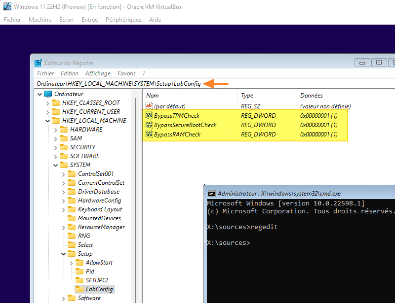 Au sein de la clé LabConfig, en fonction du ou des prérequis que vous souhaitez bypasser, il y a plusieurs valeurs à créer (faites au moins les trois premières) :
