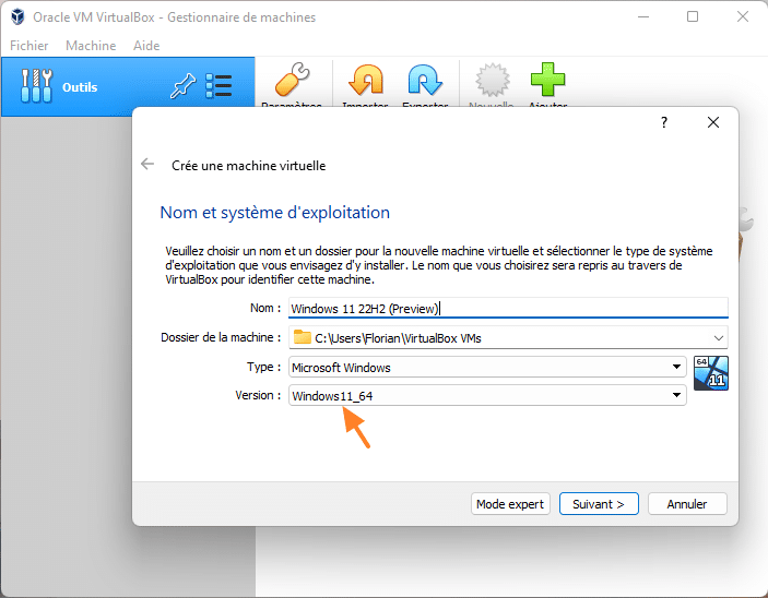 - Version : la version du système, donc pour Windows 11, nous devons sélectionner "Windows11_64"