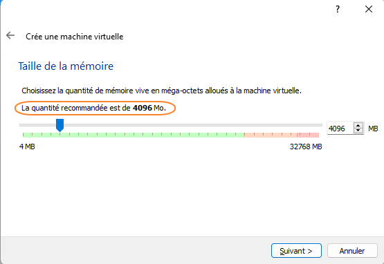 Puisque l'on a sélectionné Windows 11, VirtualBox va ajuster la configuration recommandée tout au long de l'assistant. De ce fait, pour la RAM, il va se caler sur les prérequis de Microsoft, à savoir 4 Go de RAM (mémoire vive). Si vous avez les ressources nécessaires, je vous recommande de laisser 4 Go, mais si ce n'est pas le cas vous pouvez partir sur 2 Go.