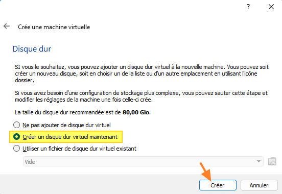 Le stockage est indispensable pour installer le système d'exploitation puis les données par la suite. Il s'agit d'une nouvelle machine virtuelle, donc choisissez "Créer un disque dur virtuel maintenant". Cliquez sur "Créer".