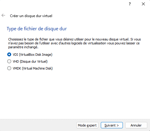 Cette machine virtuelle étant destinée à tourner uniquement en local sur notre installation de VirtualBox, vous pouvez sélectionner "VDI" puisqu'il s'agit du format natif de VirtualBox. Cliquez sur "Suivant".