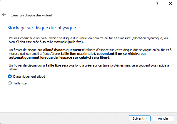 Il s'agit d'une simple machine virtuelle pour réaliser des tests sur Windows 11, donc un disque dur virtuel dynamique est adapté. Choisissez "Dynamiquement alloué" avant de poursuivre.