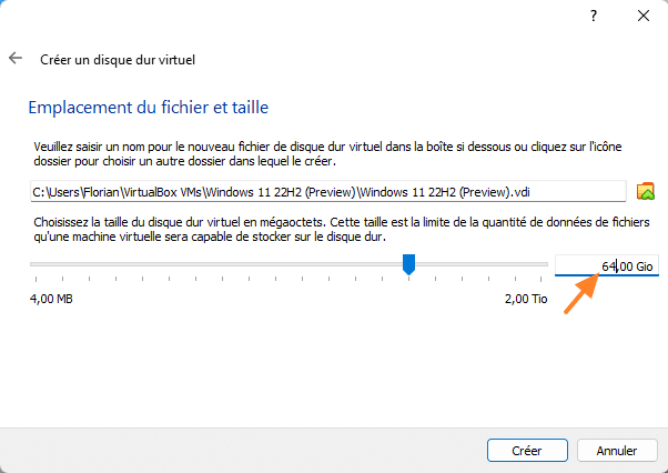 Pour la taille du disque dur virtuel, VirtualBox recommande 80 Go, enfin le curseur est positionné sur 80 Go, mais d'après la documentation de Microsoft, c'est 64 Go la valeur recommandée officiellement. J'indique une taille de 64 Go afin de respecter les prérequis de Windows 11, mais là encore, on pourrait attribuer une taille inférieure. Souvenez-vous que de toute façon, le disque dur grossira dynamiquement en fonction de l'usage utilisé. Cliquez sur "Créer" pour créer la VM !