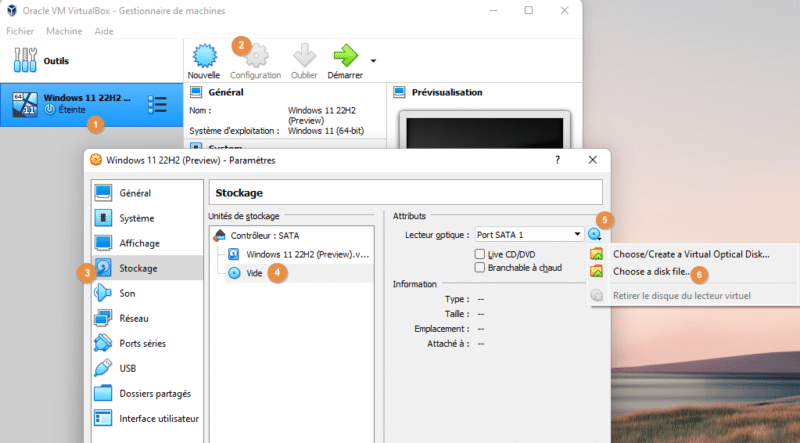 Pour finaliser la création de la machine virtuelle, nous devons spécifier l'image ISO d'installation de Windows 11 dans la configuration de la VM. En effet, sans les sources d'installation, l'affaire se complique... Suivez les étapes suivantes :