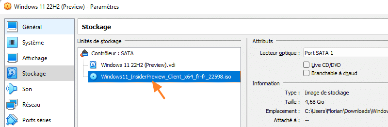 - Nom : nom de la machine virtuelle, ici "Windows 11 22H2 (Preview)"