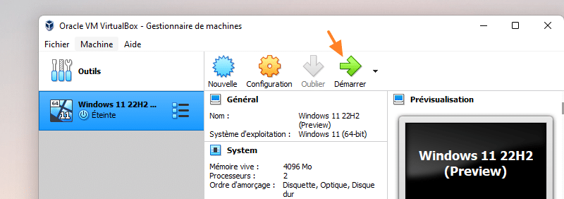 La machine virtuelle est prête, nous n'avons plus qu'à la démarrer puis à installer le système Windows 11, même si ce n'est pas si simple comme nous allons le voir. Commencez par sélectionner la VM et cliquez sur le bouton "Démarrer".