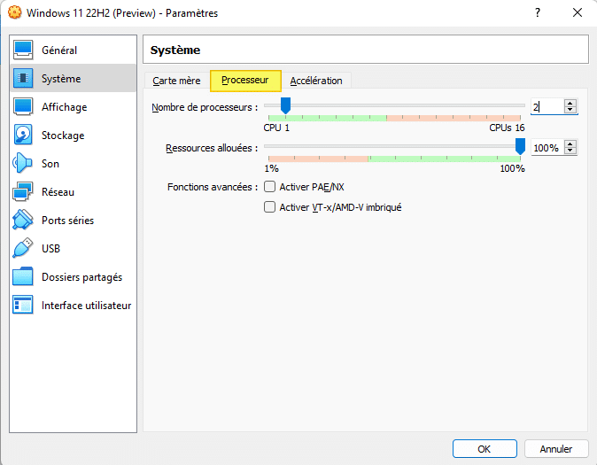 Avant de continuer, cliquez sur "Système" à gauche puis sur l'onglet "Processeur" afin de vérifier qu'il y a bien 2 processus associés à cette VM. Validez.